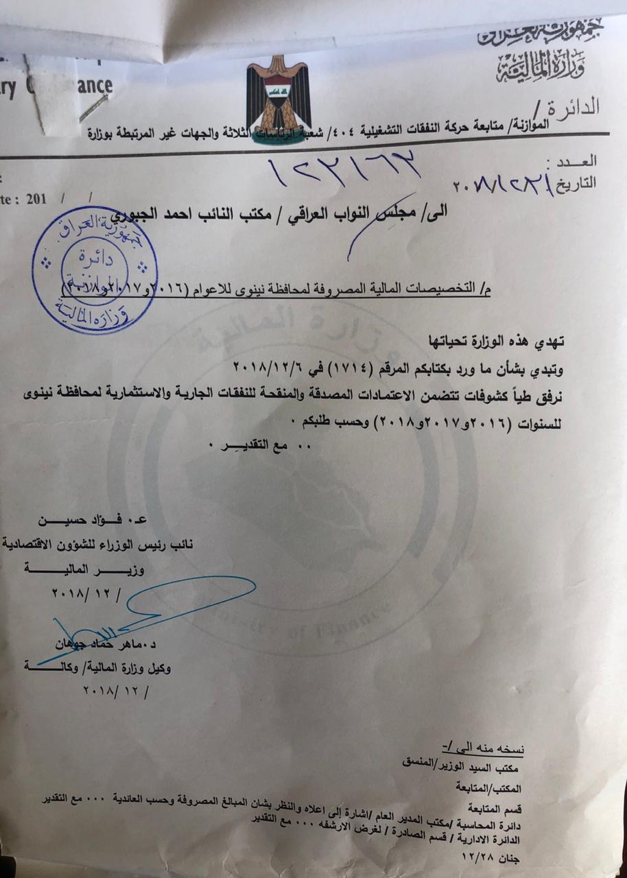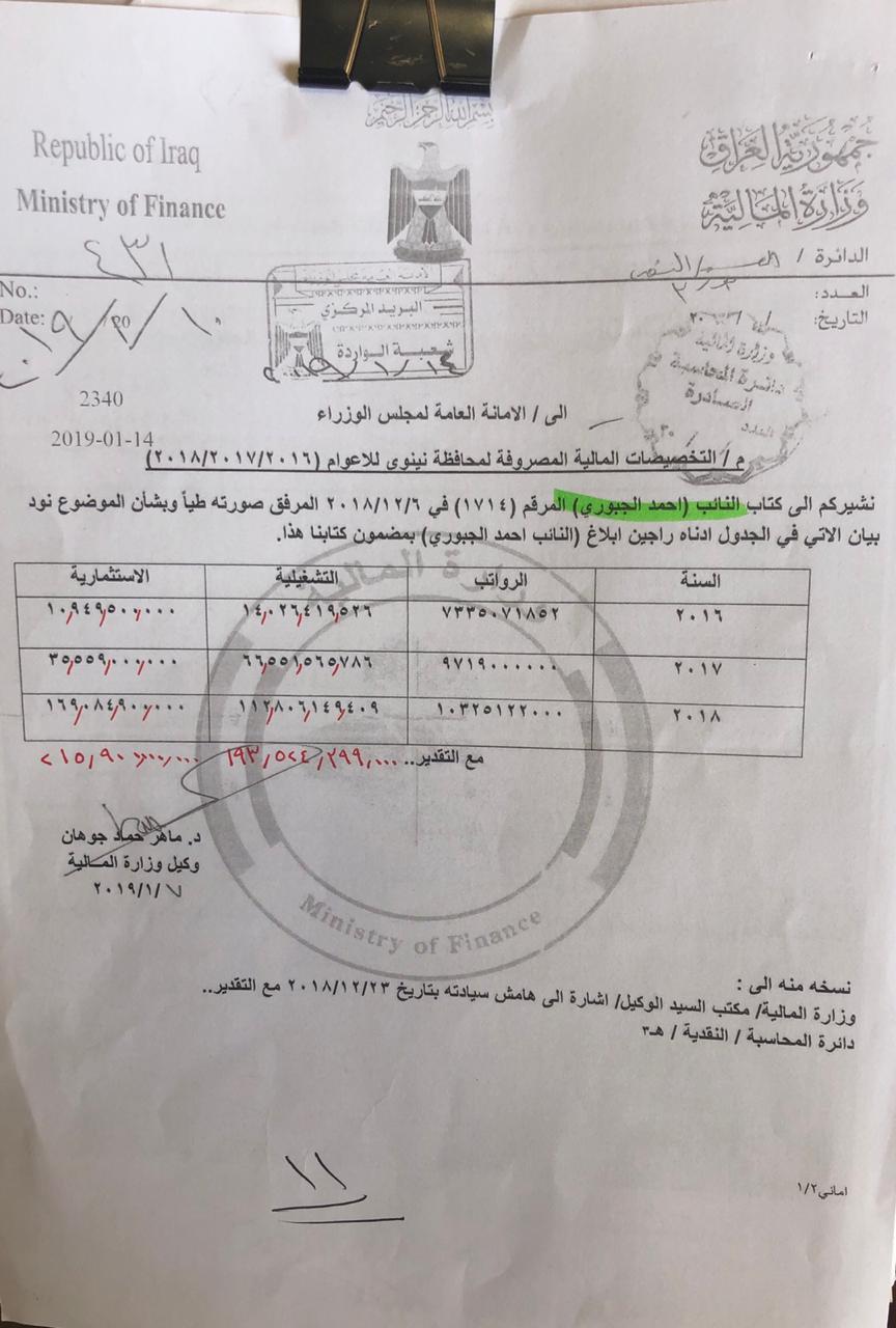 وقال الجبوري في تغريدة له على موقع تويتر، “أعلمتنا وزارة المالية استلام محافظة نينوى منذ التحرير ولغاية العام 2018 مبلغا قدره 408 مليار و614 مليون دينار ضمن الموازنة التشغيلية والاستثمارية عدا رواتب الموظفين.