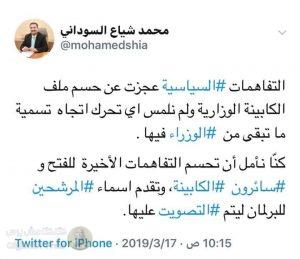 وقال السوداني في تغريدة على حسابه بـ”تويتر”، إن “التفاهمات السياسية عجزت عن حسم ملف الكابينة الوزارية”،
