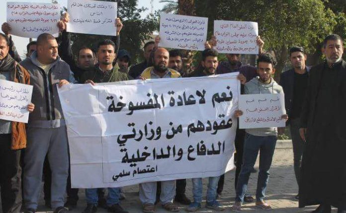 خام – بغداد: نفذ المئات من المفسوخة عقودهم في وزارتي الدفاع والداخلية تظاهرة ،اليوم الأربعاء، في ساحة التحرير وسط العاصمة بغداد للمطالبة باعادتهم الى الخدمة, داعين الحكومة الى تضمين موازنة العام المقبل مخصصات إعادتهم الى الوظيفة.
