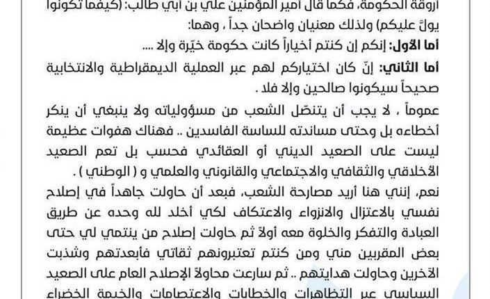 وأضاف، “أما الثاني: إن كان اختياركم لهم عبر العملية الديمقراطية والانتخابية صحيحا سيكونوا صالحين وإلا فلا. عموما ، لا يجب أن يتنقل الشعب من مسؤولياته ولا ينبغي أن ينكر أخطاءه بل وحتى مساندته للساسة الفاسدين .. فهناك هفوات عظيمة ليست على الصعيد الديني أو العقائدي فحسب بل تعم الصعيد الأخلاقي والثقافي والاجتماعي والقانوني والعلمي و(الوطني)”.