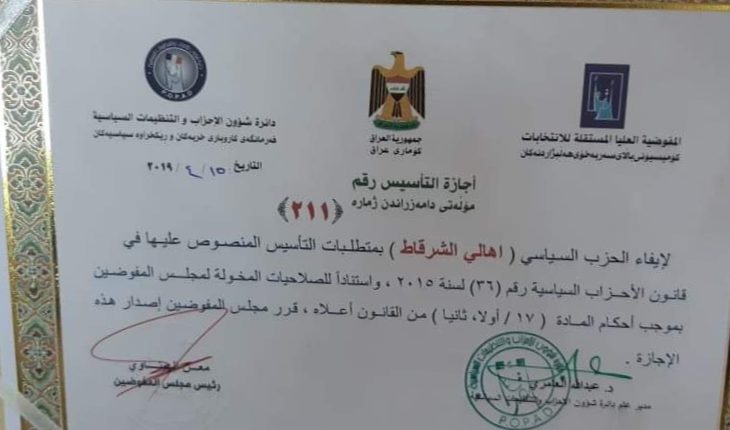 خام – صلاح الدين: أصدرت دائرة شؤون الأحزاب والتنظيمات السياسية في المفوضية العليا المستقلة للانتخابات اجازة تأسيس لحزب سياسي جديد تحت عنوان (أهالي الشرقاط ).