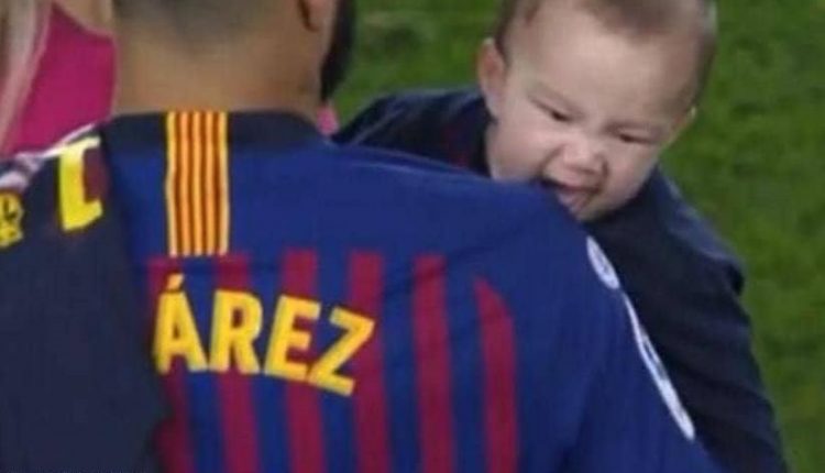 ويظهر في الصورة لوترو، طفل سواريز، البالغ من العمر 6 أشهر وهو يعض كتف والده بينما كان الأخير يحمله ويتجول فيه بالمعلب معبرا عن فرحه بالحفاظ على بطولة الليغا.
