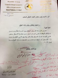 وجاء في الوثيقة التي حصلت (خام) على نسخة منها، والصادرة من مكتب الجبوري الى رئيس البرلمان: “نحن النواب الموقعون ادناه نطالب منكم الموافقة على اصدار قرار من مجلسنا الموقر ينص على تثبيت ابناء العراق واطلاق رواتبهم التي انقطعت منذ (10 اشهر) ودرجهم ضمن تخصيصات الموازنة العام 2019”.