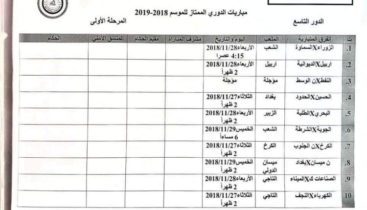 خام – بغداد: اعلنت لجنة المسابقات في الاتحاد العراقي المركزي لكرة القدم مواعيد مباريات الجولة التاسعة لدوري كرة القدم العراقي، الممتاز.