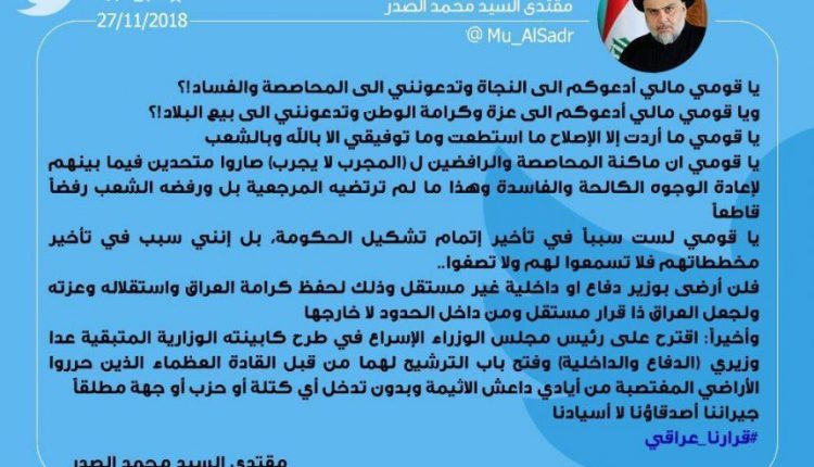 وقال الصدر في تغريدة له على حسابه الرسمي في تويتر، “يا قومي مالي ادعوكم الى النجاة وتدعونني الى المحاصصة والفساد، ويا قومي مالي ادعوكم الى عزة وكرامة الوطن وتدعونني الى بيع البلاد، ويا قومي ما اردت الا الاصلاح ما استطعت وما توفيقي الا بالله وبالشعب”.