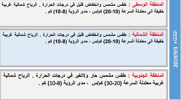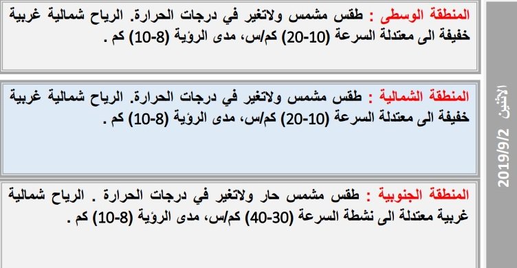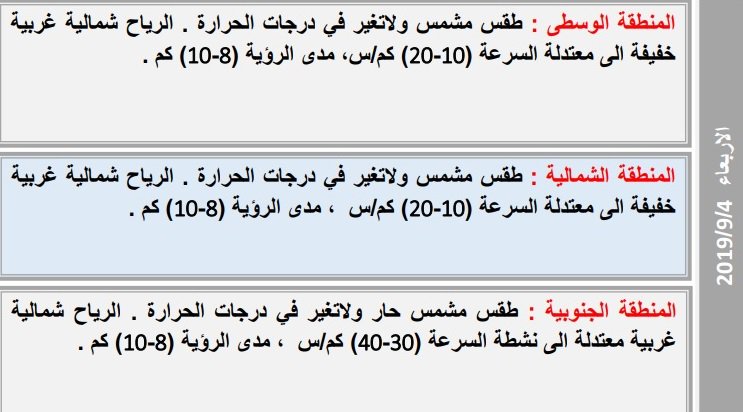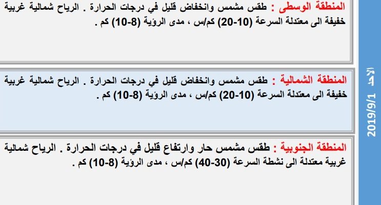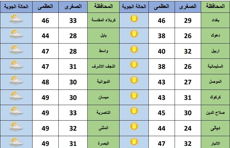 خام -بغداد :”نشرت هيئة الانواء الجوية، تقريرا بشان حالة الطقس للاسبوع الحالي، فيما توقعت انخفاض قليل بدرجات الحرارة”.