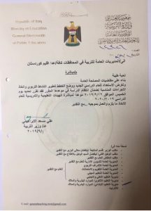 حيث تم تحديد”يوم الخميس الـ12 من ايلول الجاري موعداً لمباشرة الهيئات التعليمية والتدريسية للعام الدراسي 2019-2020، وذلك لغرض الاستعداد للعام الدراسي الجديد ووضع الخطط لتطوير النشاط التربوي واتخاذ الاجراءات المناسبة لضمان انتظام الدراسة في موعدها المقرر وكما موضح في الكتاب الرسمي الصادر ادناه”.انتهى(ع-ع)