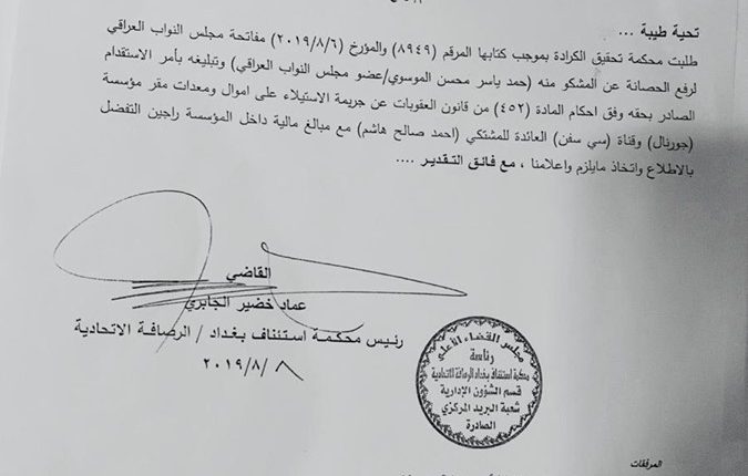 وواشارت وثيقة صادرة عن مجلس القضاء الاعلى حصلت “خام” على نسخة منها، إلى طلب مقدم من قبل محكمة تحقيق الكرادة بمفاتحة مجلس النواب العراقي لرفع الحصانة عن الموسوي وتبليغه بامر الاستقدام الصادر بحقه وفق احكام المادة (452) من قانون العقوبات عن جريمة الاستيلاء على اموال ومعدات مقر مؤسسة (جورنال) وقناة (سي سفن) العائدة للمشتكي (احمد صالح هاشم) مع مبالغ مالية داخل المؤسسة.