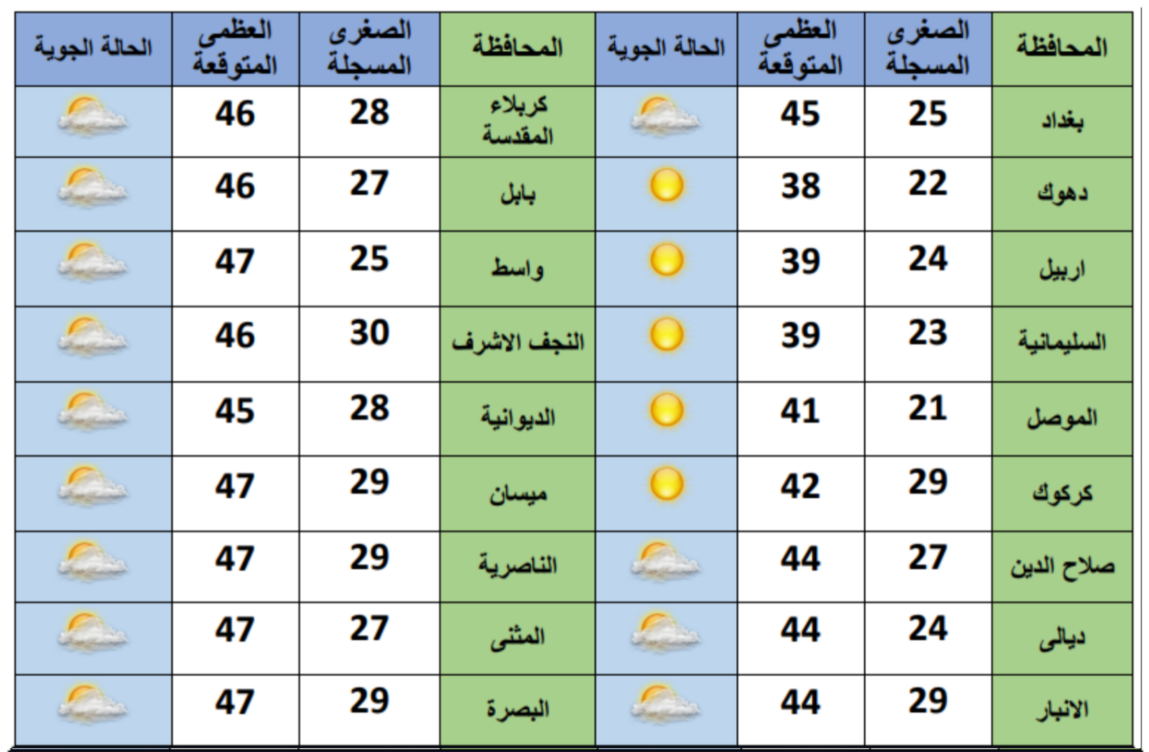 خام-بغداد:”أعلنت الهيئة العامة للأنواء الجوية والرصد الزلزالي، الثلاثاء، عن توقعات حالة الطقس ودرجات الحرارة في عموم مناطق البلاد”.وذكرت الهيئة في بيان لها، اليوم، (17 ايلول 2019)، تابعته “خام”، ان طقس اليوم، سيكون غائما جزئيا في المناطق الوسطى والجنوبية، فيما سيكون مشمسا مع وجود بعض الغيوم في المناطق الشمالية.واضاف ان ارتفاع في درجات الحرارة ستشهده المناطق الوسطى والشمالية، فيما ستكون الحرارة ثابتة في المناطق الجنوبية.واشار الى ان” بغداد ستسجل درجة حرارة عظمى تبلغ 45 مئوية، فيما تسجل البصرة 47 مئوية، في حين تكون دهوك الاكثر انخفاضا في درجات الحرارة حيث تسجل 38 مئوية”.انتهى(ع-ع)