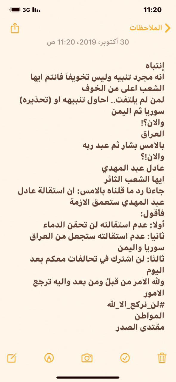 وتابع الصدر مخاطبا العراقيين ايها الشعب الثائر جاءنا رد ما قلنا بالأمس، ان استقالة عبد المهدي ستعمق الأزمة، فأقول أولا: عدم استقالته لن تحقن الدماء، ثانيا عدم استقالته ستجعل العراق سوريا واليمن