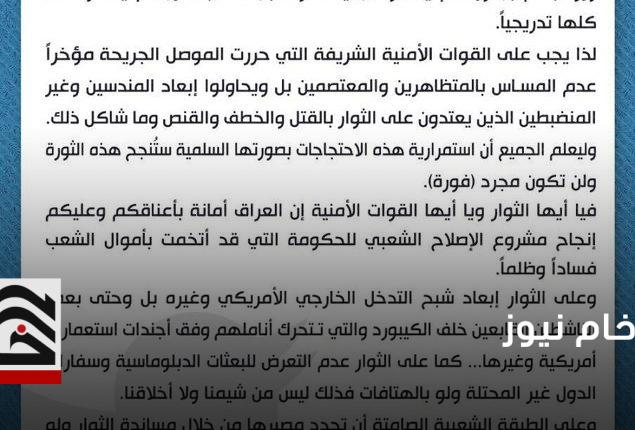 كما طالب الصدر بمحاسبة قتلة المتظاهرين فورا، والدعوة إلى التظاهر مجددا، داعيا الموظفين إلى إعلان الإضراب العام لمساندة المتظاهرين، وطالب أئمة الجمعة بقيادة مظاهرات سلمية أيضا.