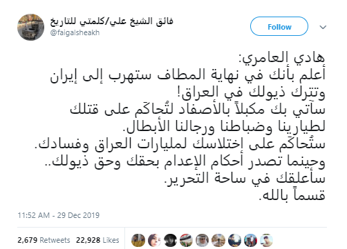 وبحسب منشور لصفحة شيخ علي الرسمية على تويتر، وجه كلامه للعامري، “أعلم بأنك في نهاية المطاف ستهرب إلى إيران وتترك ذيولك في العراق! سآتي بك مكبلاً بالأصفاد لتُحاكَم على قتلك لطيارينا وضباطنا ورجالنا الأبطال. ستُحاكَم على اختلاسك لمليارات العراق وفسادك. وحينما تصدر أحكام الإعدام بحقك وحق ذيولك.. سأعلقك في ساحة التحرير، قسماً بالله”.