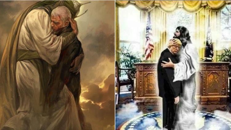 تداول ناشطون على مواقع التواصل الاجتماعي، صورا للسيد المسيح يحتضن الرئيس دونالد ترامب، ردا على الصورة التي نشرها موقع المرشد الإيراني، علي خامنئي، وتظهر احتضان الإمام الحسين لقاسم سليماني.