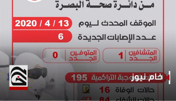 وقالت الدائرة في بيان وردت لـ”خام” نسخة منه ، إن “محافظة البصرة سجلت اليوم 6 اصابات جديدة بفيروس كورونا، وحالة شفاء واحدة، وعم تسجيل وفاة”.