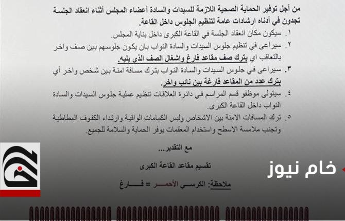 وتضمنت وثيقة صادرة عن دائرة العلاقات العامة والتشريفات في المجلس، أن “مكان انعقاد الجلسة سيكون في القاعة الكبرى داخل بناية المجلس، وسيراعي في تنظيم جلوس السيدات والسادة النواب بأن يكون جلوسهم بين صف واخر بالتعاقب أي يترك صف مقاعد فارغ وإشغال الصف الذي يليه”.
