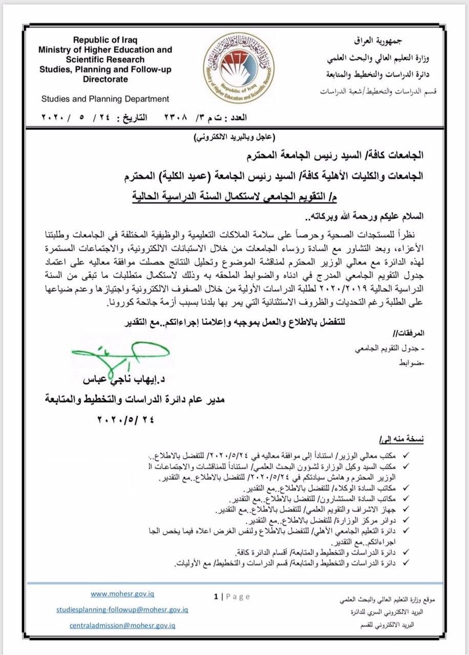 خام-بغداد:وافق وزير التعليم العالي نبيل كاظم عبد الصاحب، الاثنين، على انهاء متطلبات العام الدراسي لطلبة الدراسات الاولية، وتحديد موعد الامتحانات النهائية، فضلا عن اجراء الامتحانات “السريرية” لطلبة المجموعة الطبية.