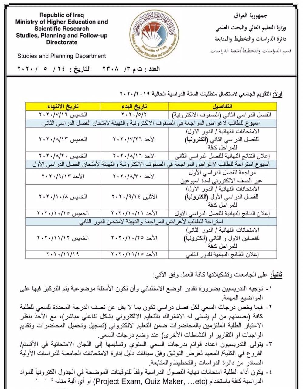وذكر بيان للوزارة تلقت “خام”، نسخة منه، (25 آيار 2020)، أنه “نظرا للظرف الصحي الطارئ وحرصا على استكمال متطلبات العام الدراسي الحالي 2019/2020 تعلن وزارة التعليم العالي والبحث العلمي توقيتات الامتحان النهائي وآليات أدائه إلكترونيا في الدراسات الأولية إلتزاما بسياقات وإجراءات السلامة الوقائية المعمول بها”.