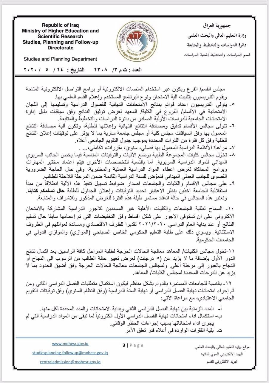 وبشأن أداء الامتحانات فإن “الآليات المعتمدة هي المنصات الإلكترونية أو برامج التواصل الإلكتروني أو أية آلية إلكترونية مناسبة يقرها مجلس القسم أو الفرع العلمي”.