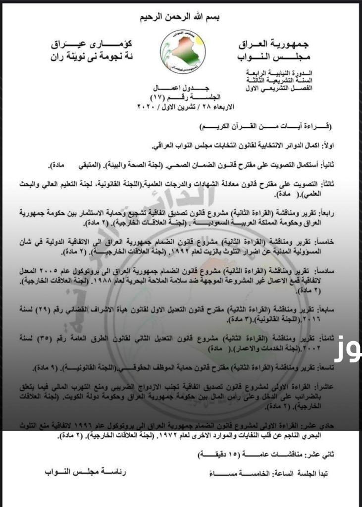 وذكرت الدائرة في بيان، تلقت “خام” نسخة منه، (28 تشرين الاول 2020)، ان، جدول اعمال الجلسة السابعة عشر من الدورة النيابية الرابعة للسنة الثالثة ضمن الفصل التشريعي الاول سيتضمن 12 فقرة، في مقدمتها اكمال الدوائرة الانتخابية لقانون انتخابات البرلمان العراقي.انتهى(ع-ع)