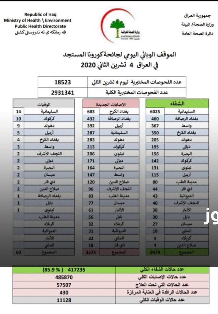 الوزارة قالت في بيان تلقت “خام” نسخة منه، اليوم الأربعاء (4 تشرين الثاني 2020) إنها سجلت 3574 إصابة جديدة بفيروس كورونا في البلاد خلال الـ24 ساعة الماضية، ليرتفع عدد المصابين الكلي في العراق منذ انتشار الفيروس إلى 458870 إصابة.