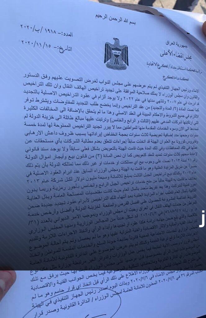 يذكر أن تراخيص الهاتف النقال قد أبرمت عام 2007 وتنتهي مدتها 2022، في حين لايوجد إلزام في عقودها بالتجديد، وإنما يخضع طلب التجديد للمفاوضات، حسب القضاء العراقي.انتهى(ع-ع)