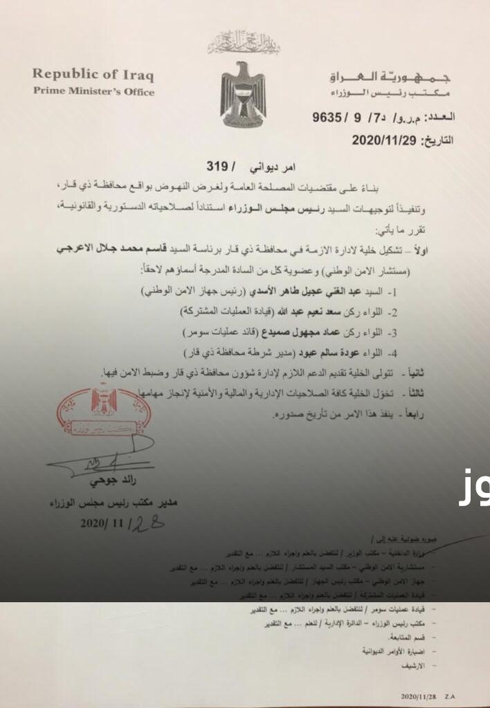 وأضاف، |وعلى ذلك، قررنا تشكيل لجنة عالية المستوى من الحكومة المركزية بعنوان (فريق أزمة الطوارئ) يمنح صلاحيات إدارية ومالية وأمنية لحماية المتظاهرين السلميين، ومؤسسات الدولة، والممتلكات الخاصة، وقطع الطريق أمام كل ما من شأنه زرع الفتنة، وجعل المتظاهرين السلميين في مواجهة مع الدولة التي حرصت منذ أن تولّت الحكومة مسؤوليتها، على نصرة الاحتجاج السلمي، ودعم التوجّهات العادلة التي طالب بها شباب العراق”.