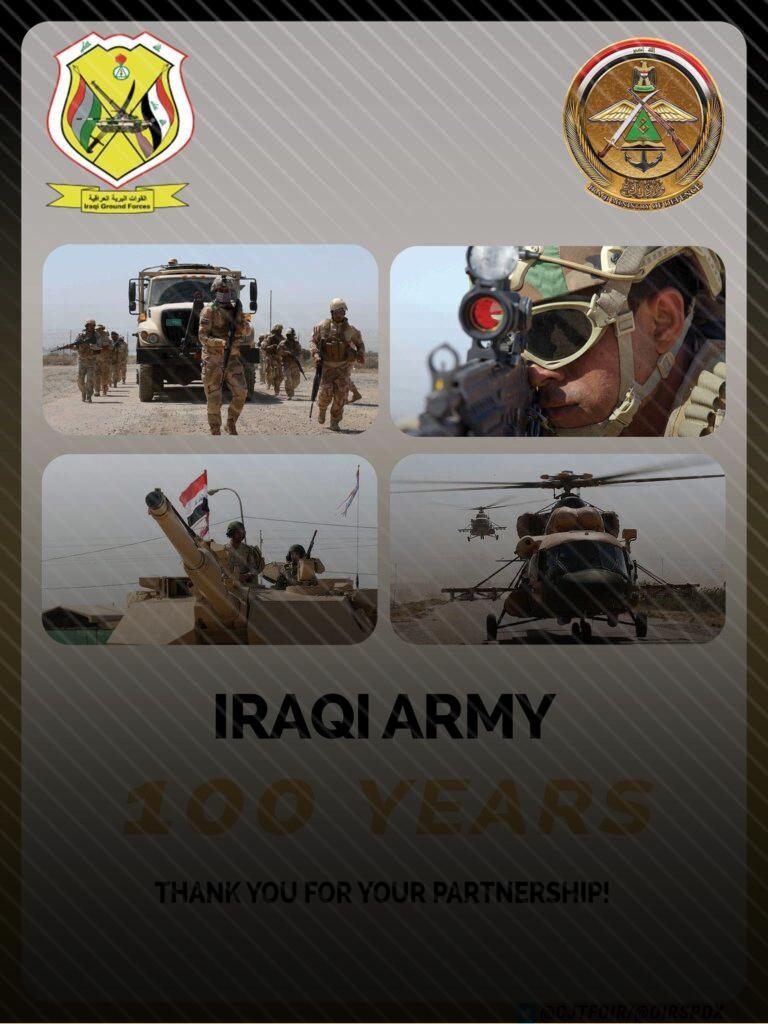 وذكر بيان للتحالف الدولي، تلقت “خام” نسخة منه، (6 كانون الثاني 2021)، أن “التحالف يهنيء الجيش العراقي بالإحتفال بعيد ميلاده المائة”، مضيفا أنه “تم إنشاء الجيش العراقي في 6 كانون الثاني 1921 ، ولا يزال يواصل مسيرته كشريك رئيسي في المعركة من أجل هزيمة داعش”.