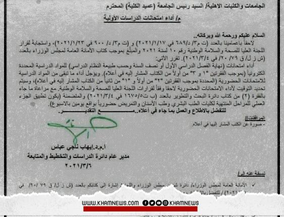 وحصلت وكالة خام نيوز على وثيقة تؤكد أن الامتحانات ستكون بشكل إلكتروني للمواد المحددة سابقاً، الى جانب أن تكون نسبة ٤٠ ٪ إلكتروني و٦٠٪ حضوري، إذ يتم أداء المواد المحدد إلكترونية نصف سنة او نهاية كورس وتؤجل المواد المحددة حضورية الى وقت لاحق على ان يتم تحديد جدول خاص لأداء الامتحانات الحضورية لاحقاً. انتهى (أ-ر).