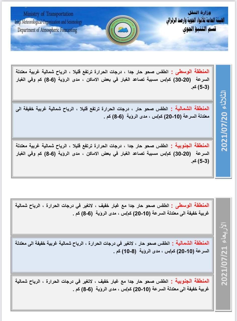 بالجداول.. حالة الطقس في عموم العراق للأيام الاربعة المقبلة