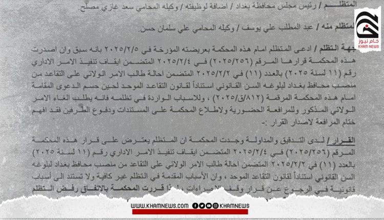 كشفت وثيقة مسربة صادرة عن محكمة القضاء الإداري، اليوم الإثنين، وحصلت وكالة “خام نيوز” على نسخة منها، عن رد اعتراض رئيس مجلس محافظة بغداد المقال عمار القيسي والإبقاء عبد المطلب العلوي بمنصبه محافظا لبغداد.