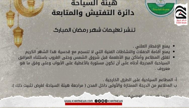 نشرت دائرة التفتيش والمتابعة في هيئة السياحة، اليوم الثلاثاء، تعليمات متعقلة بشهر رمضان المبارك.