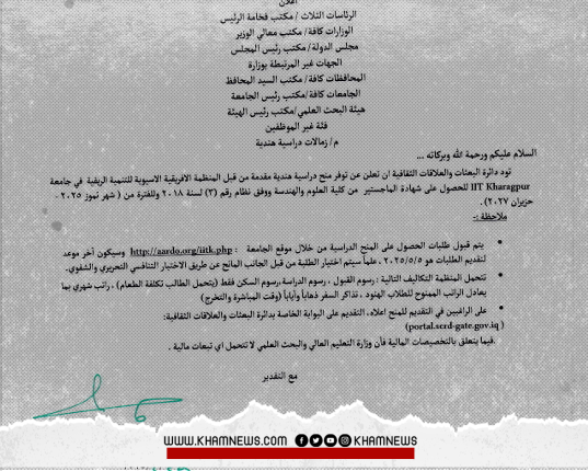 وذكرت دائرة البعثات والعلاقات الثقافية في وثيقة متداولة تلقت وكالة “خام نيوز” نسخة منها، أن “آخر موعد للتقديم على هذه المنح هو يوم 5 أيار 2025″، وأن “اختيار الطلبة يتم من قبل الجانب المانح بعد إجراء الاختبار التنافسي التحريري والشفوي”. انتهى ع1