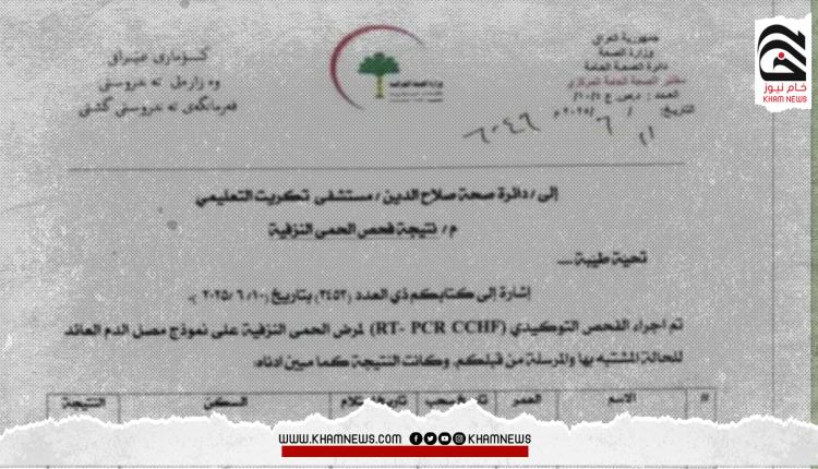 وقال مصدر طبي في تصريح خاص لـ”خام نيوز”، إن “نتائج الفحوص المختبرية (RT-PCR CCHF) التي أجريت لمواطن من أهالي سامراء أظهرت إصابته المؤكدة بالحمى النزفية”، موضحاً أن “المصاب يُدعى كهلان فتاح هلال (41 عاماً)، وقد تم سحب العينة منه في العاشر من حزيران الجاري، وأُرسلت إلى مختبر الصحة العامة المركزي في بغداد، حيث تم تأكيد النتيجة اليوم”.