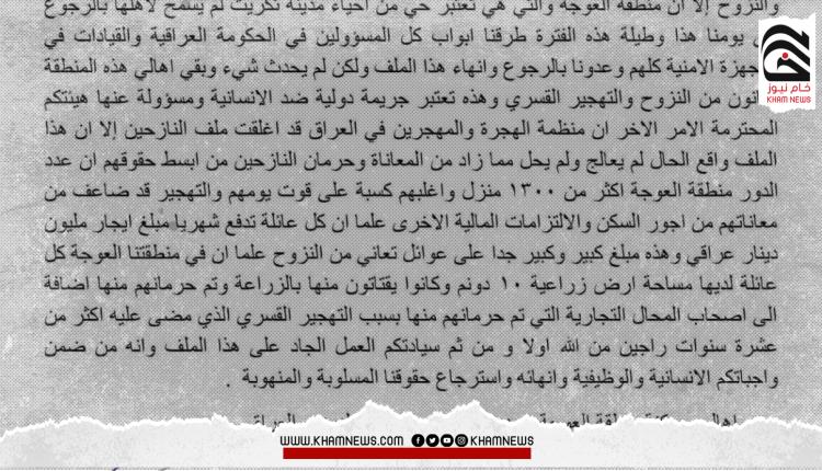 وجّه أهالي منطقة العوجة في محافظة صلاح الدين، اليوم الأحد، مناشدة عاجلة إلى ممثل هيئة الأمم المتحدة في العراق، السيد محمد الحسان، للتدخل في إنهاء معاناتهم الممتدة منذ أكثر من عشر سنوات نتيجة التهجير القسري، عقب اجتياح تنظيم داعش الإرهابي للمنطقة عام 2014.